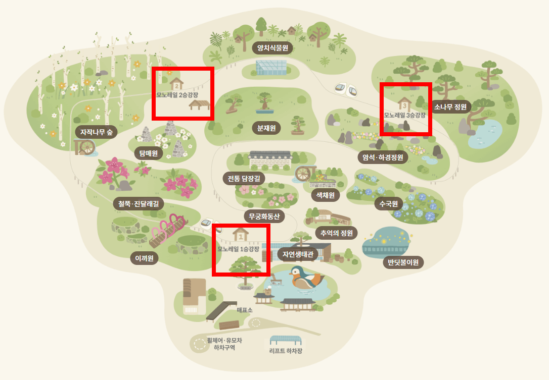 모노레일은 노약자의 편리하고 안전한 관람을 위해 화담숲 서쪽 이끼원 입구 - 화담숲 정상- 분재원 사이를 지나 1,213m의 순환선으로 구간별 또는 순환하여 붉게 물든 화담숲 전체를 조망하실 수 있습니다.